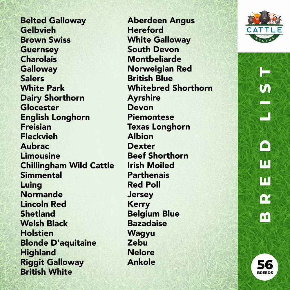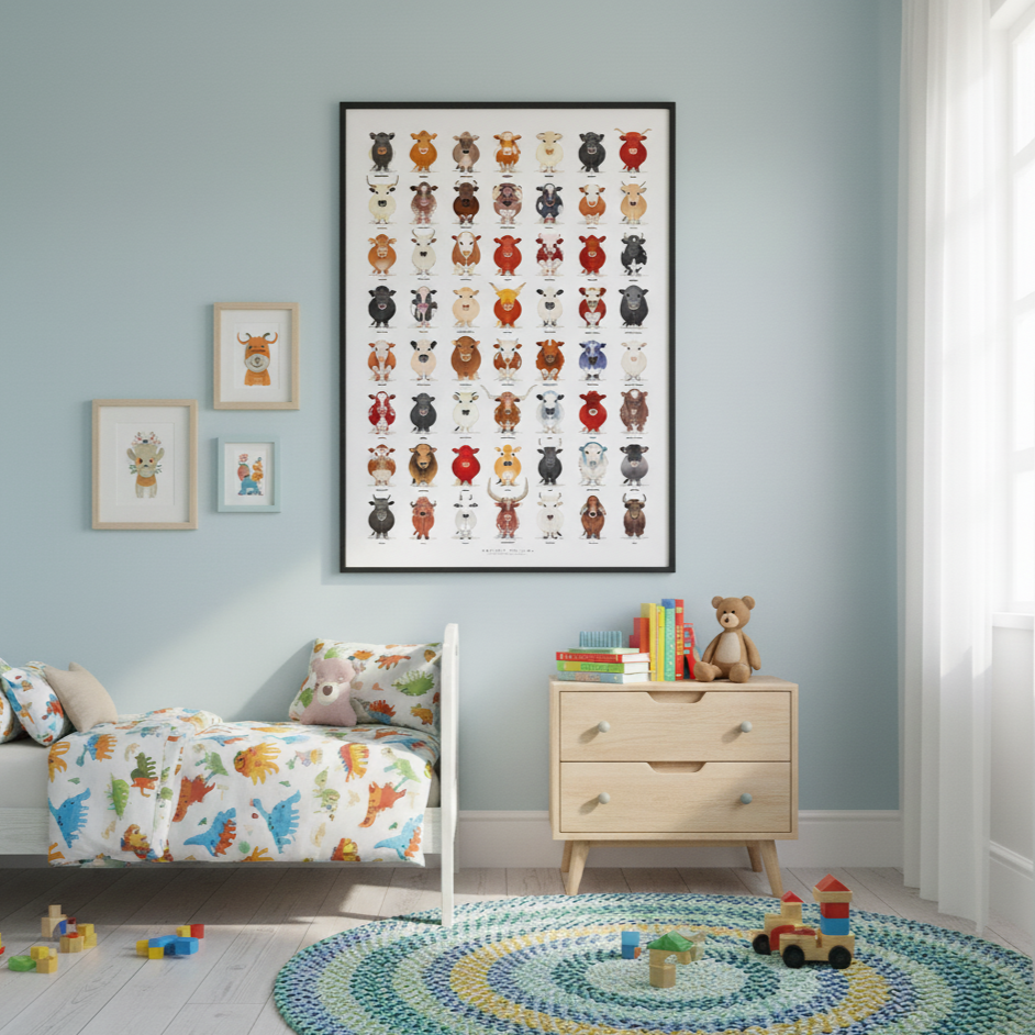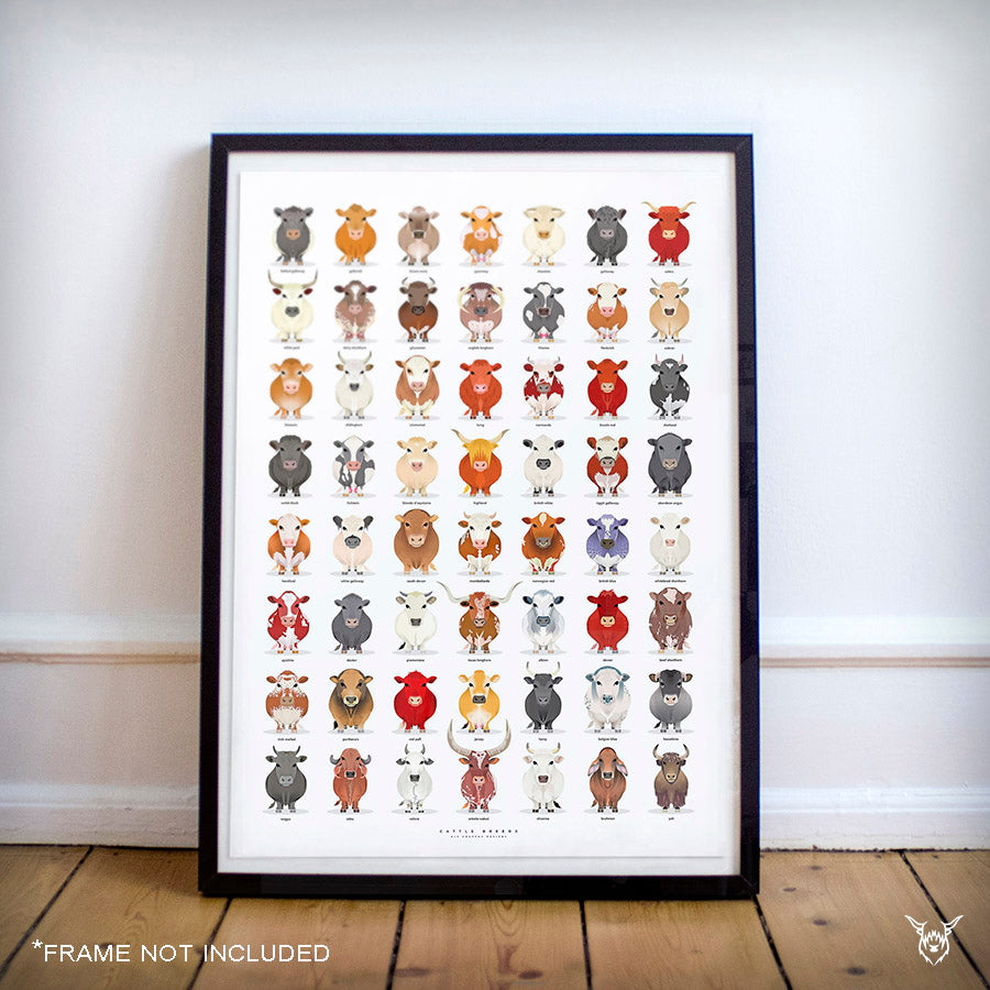 Bring rustic charm and educational flair to your walls with this beautifully illustrated Cattle Breeds Poster. Featuring 56 cow breeds in a fun and colourful style, this art print is perfect for farmers, ranchers, educators, and cow lovers alike.